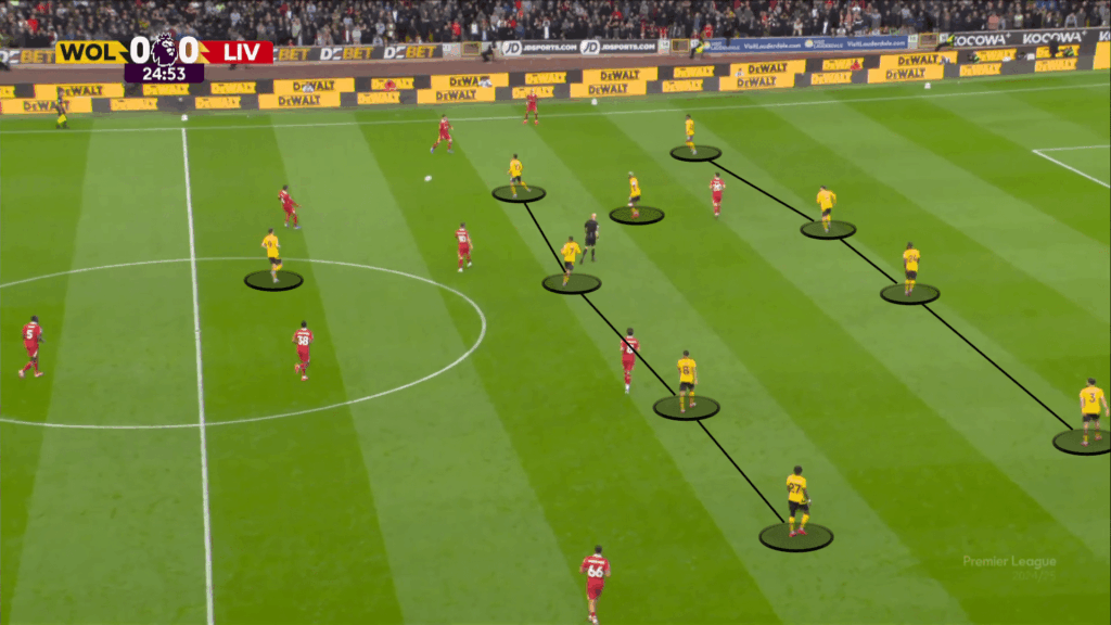 وولفرهامبتون سيحاول الدفاع بعمق ثم التحول بسرعة عبر تمريرة أولى دقيقة نحو المساحات خلف الظهيرين لذلك جودة التغطية العكسية والارتداد السريع بعد فقدان الكرة ستكون عامل أمان مهم لليفربول طوال المباراة